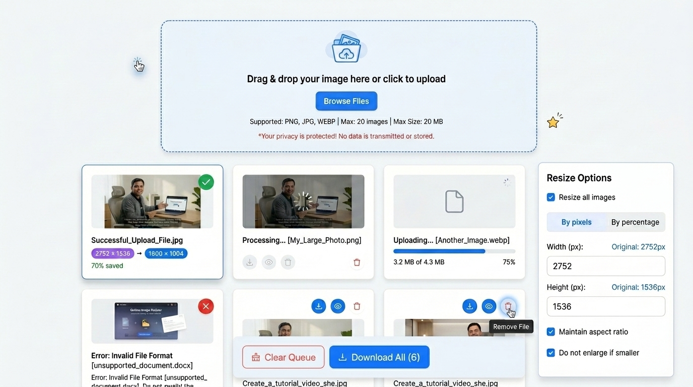 The security of your images is guaranteed since files are not stored permanently on the server, but the processing is carried out instantaneously.